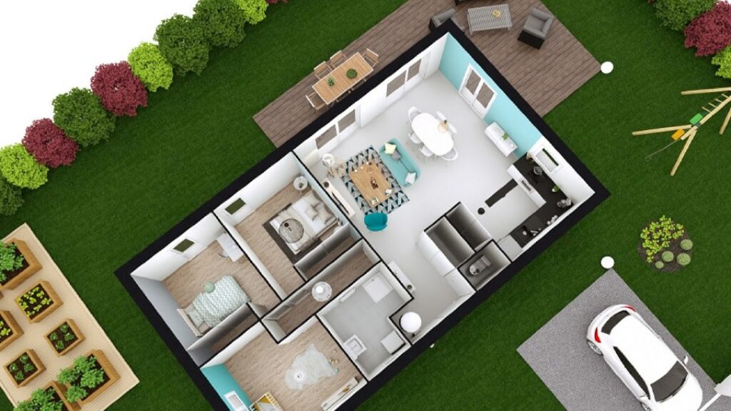 Elle est composée de trois chambres, d'une cuisine et d'une salle de bains. Cette maison est neuve.