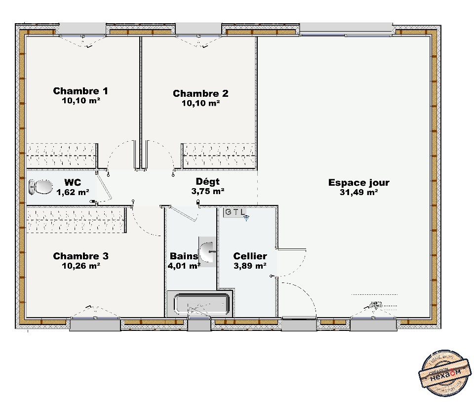 Elle propose trois chambres, une cuisine et une salle de bains. Cette maison est neuve.
