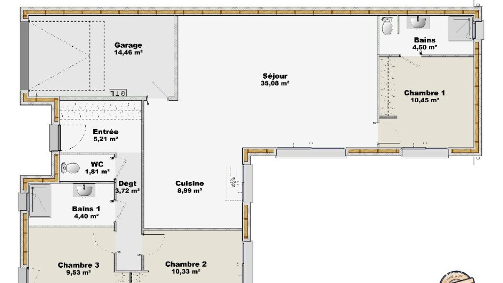 Elle comporte trois chambres, une cuisine et deux salles de bains. Cette maison est neuve.