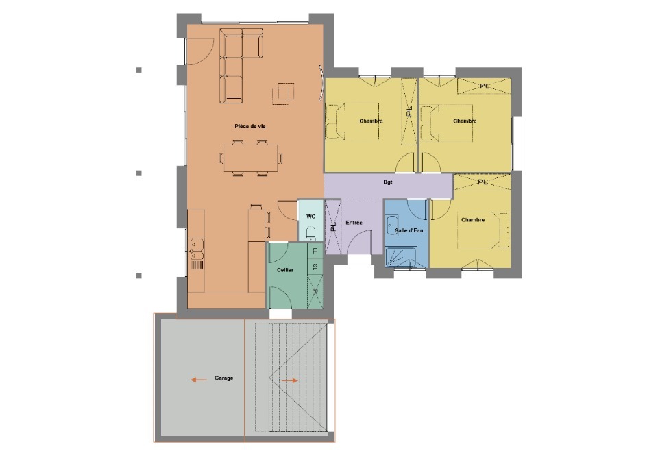Conçue de plain-pied, elle est composée de trois chambres, d'une cuisine et d'une salle de bains. Cette maison est neuve.