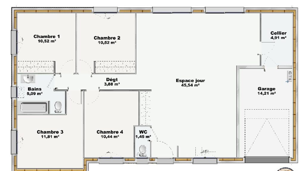Cette maison est de plain-pied. Conçue de plain-pied, elle est composée de quatre chambres, d'une cuisine et de deux salles de bains. La maison est neuve.