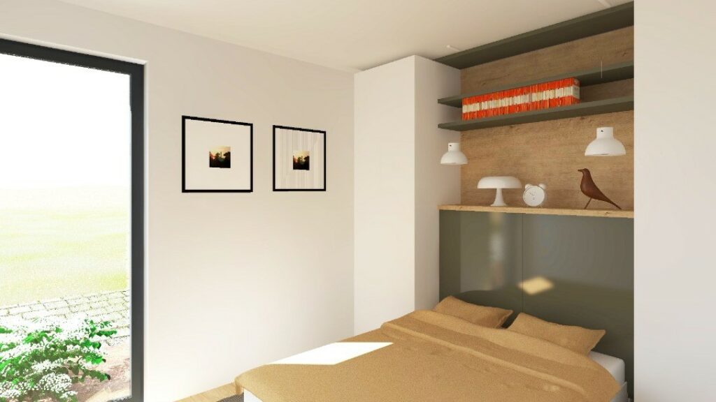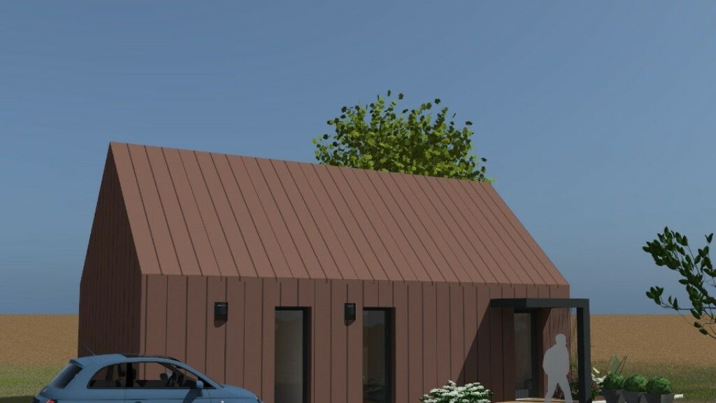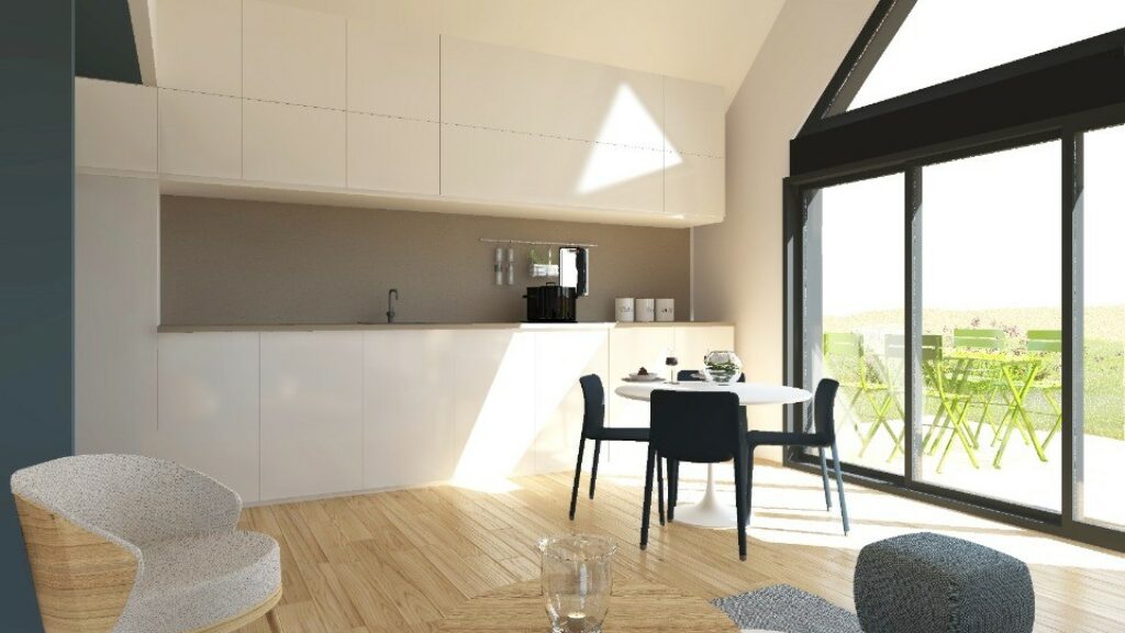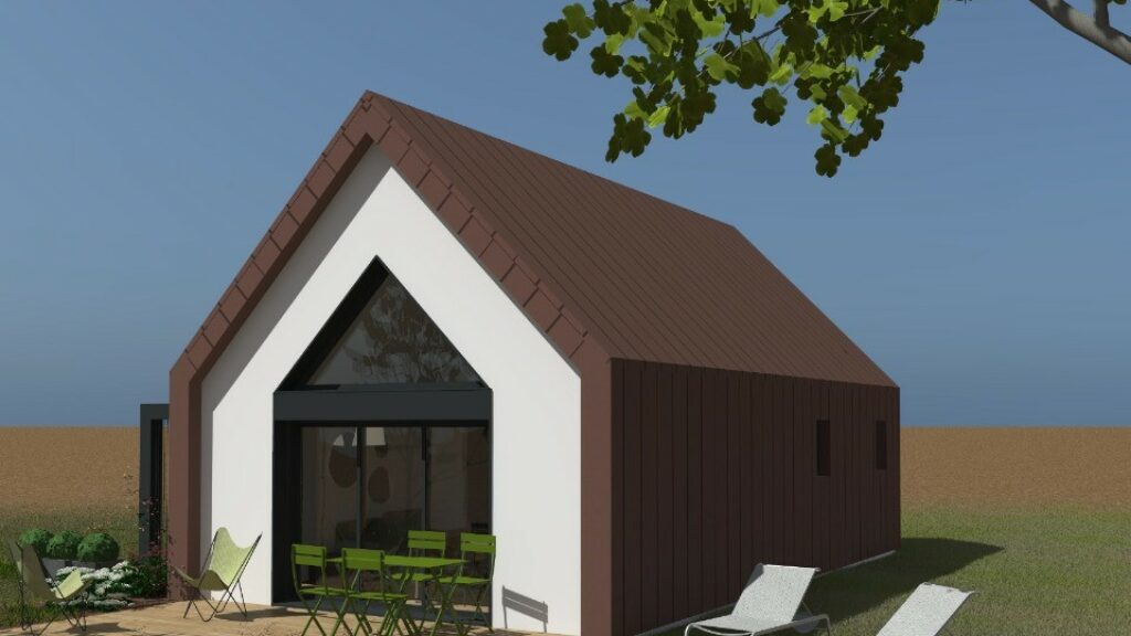 Conçue de plain-pied, elle compte une chambre, une cuisine et une salle de bains. Cette maison est neuve.