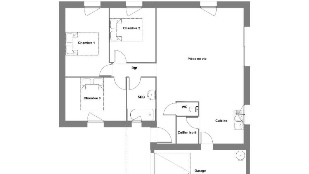 Conçue de plain-pied, elle offre trois chambres, une cuisine et une salle de bains. Cette maison est neuve.